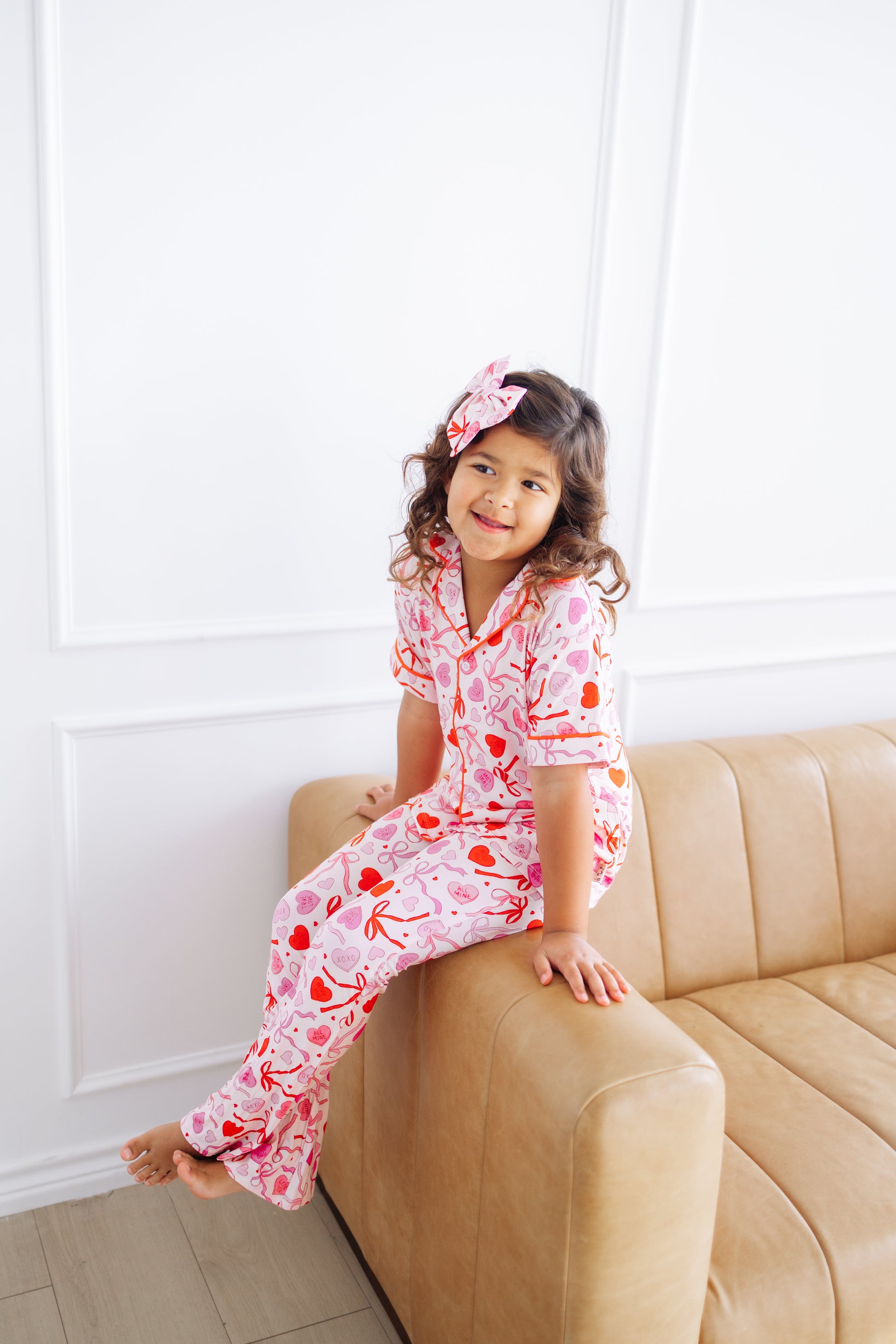 Add some sweet style to your wardrobe with our Sweetheart Ribbons Set! The collared shirt features buttons, short sleeves, and a flattering fit. Paired with flare pants complete with an elastic waistband and functional pockets, this set is both stylish and comfortable.
