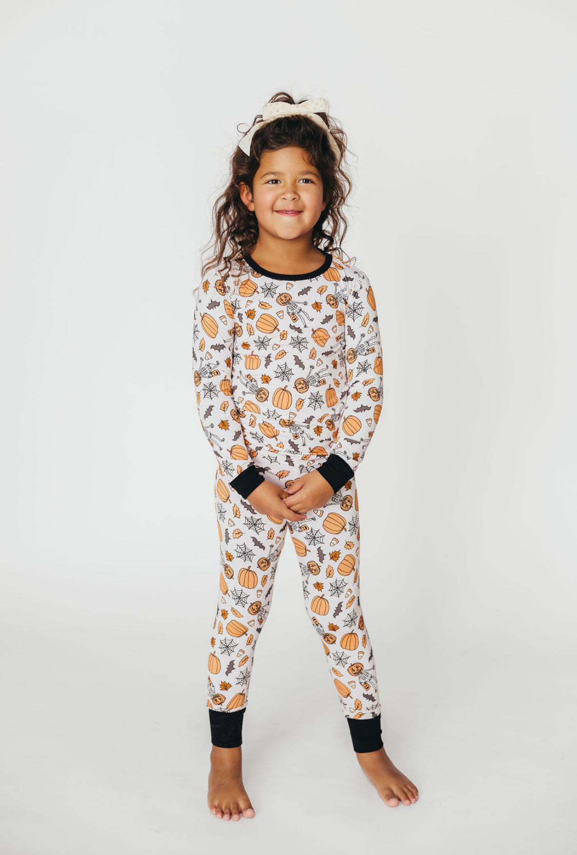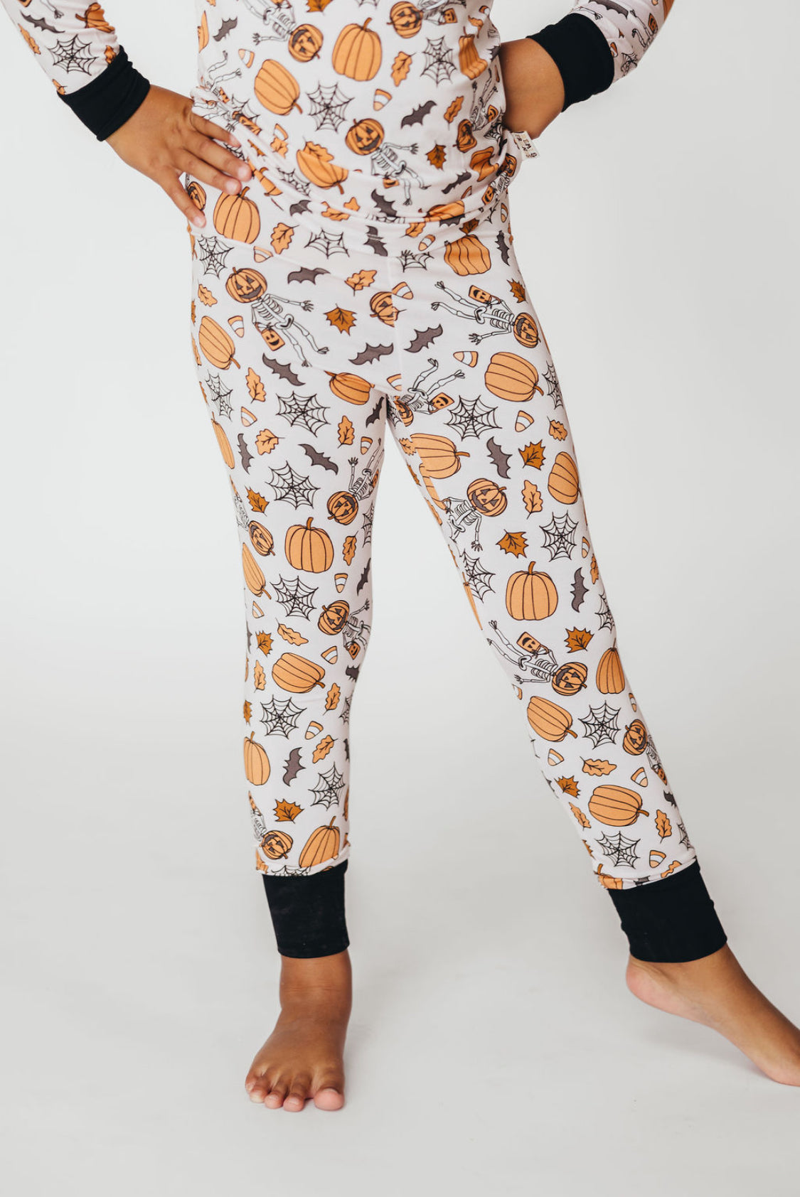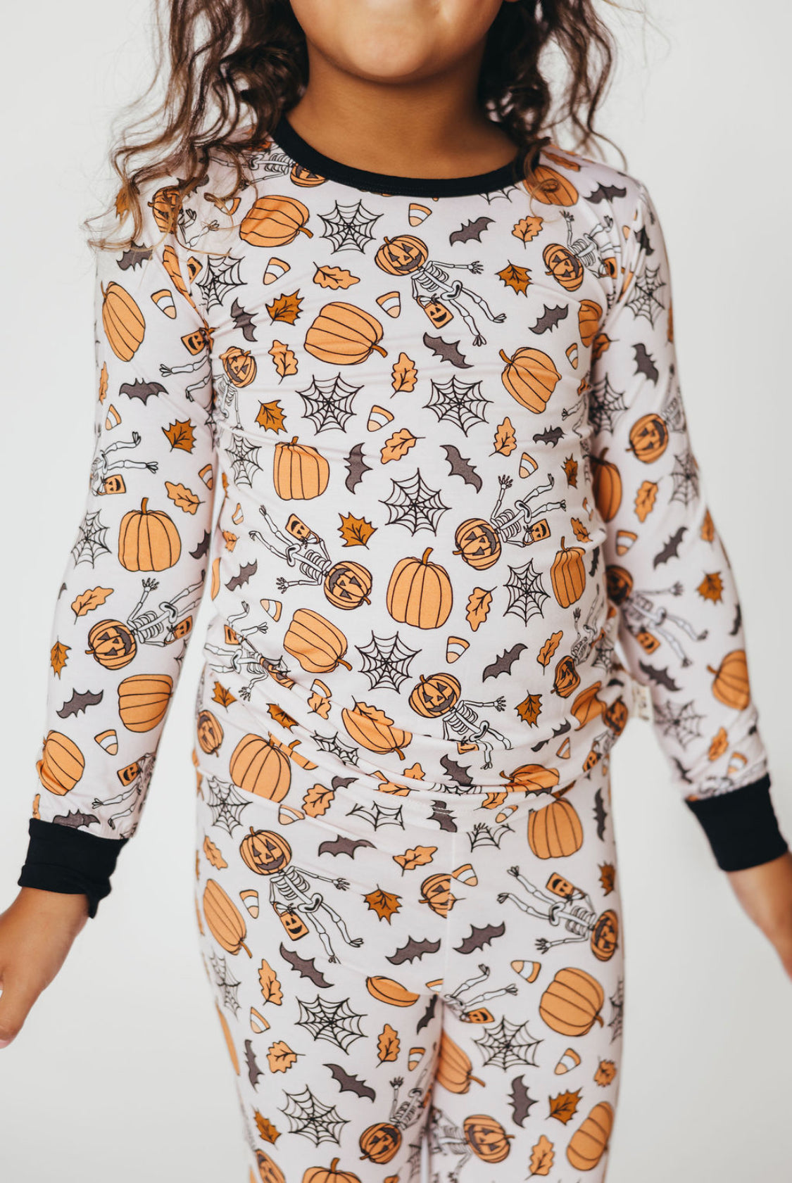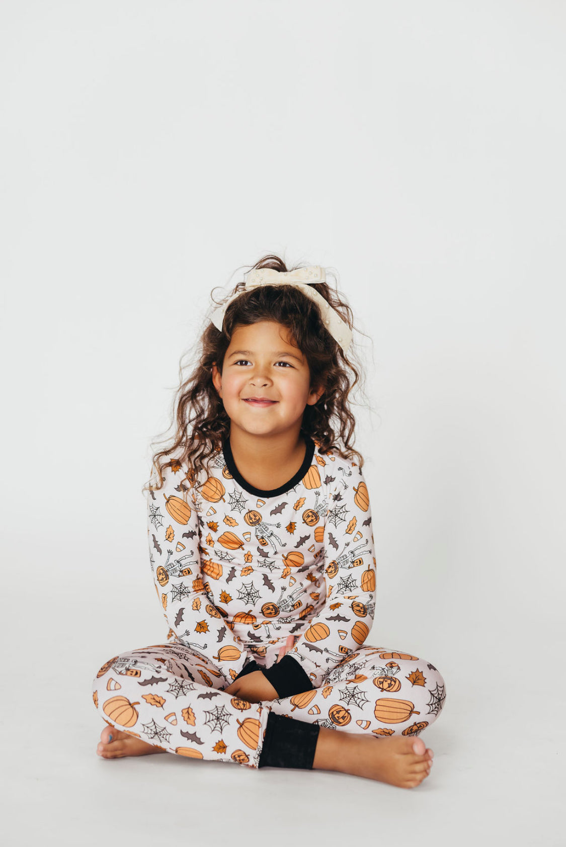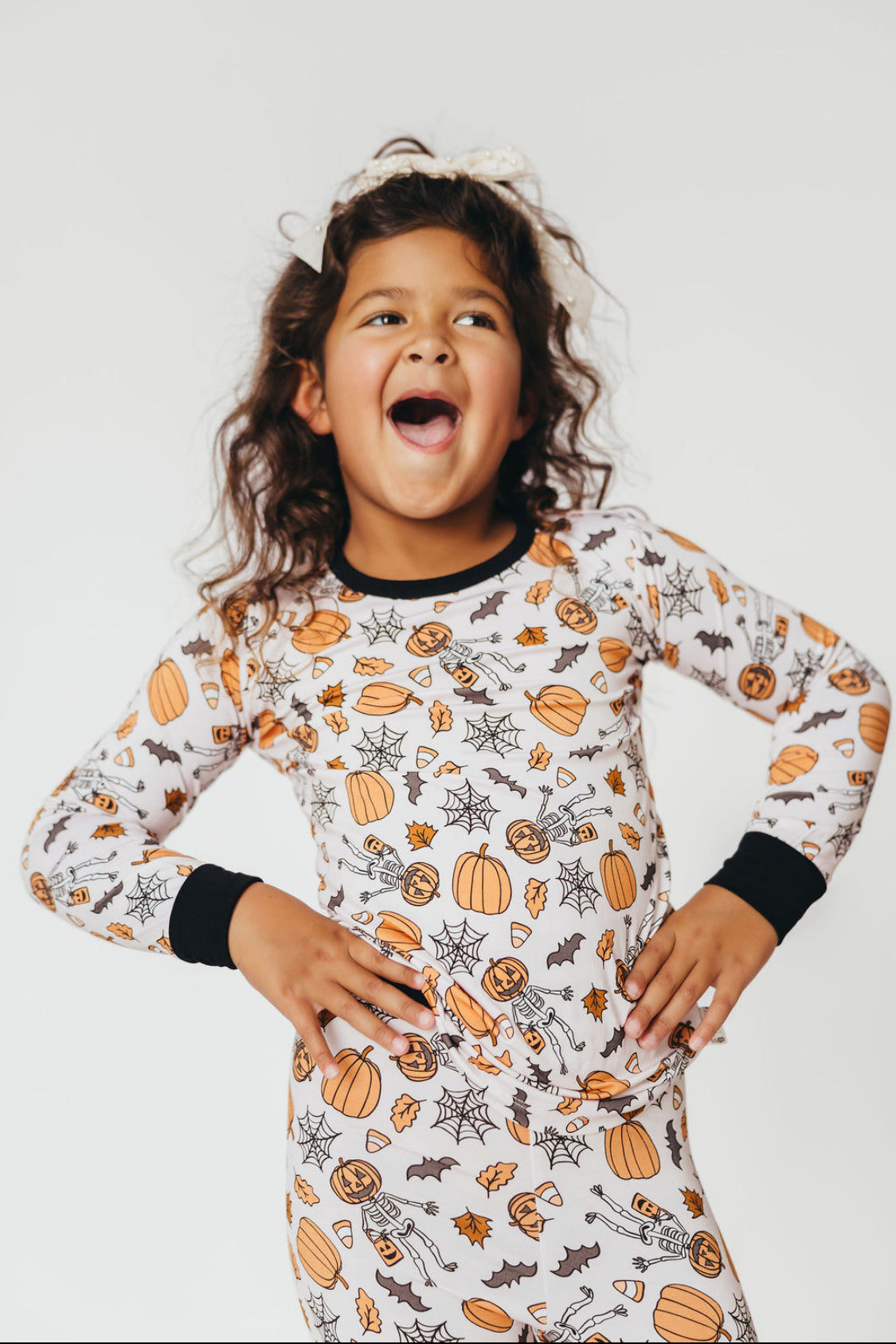 Get ready for Halloween with the Jack O' Bones Long Set! This playful two-piece set features a spooky pumpkin head Skelly and trick-or-treat bags on the print. The perfect outfit for all things spooky.