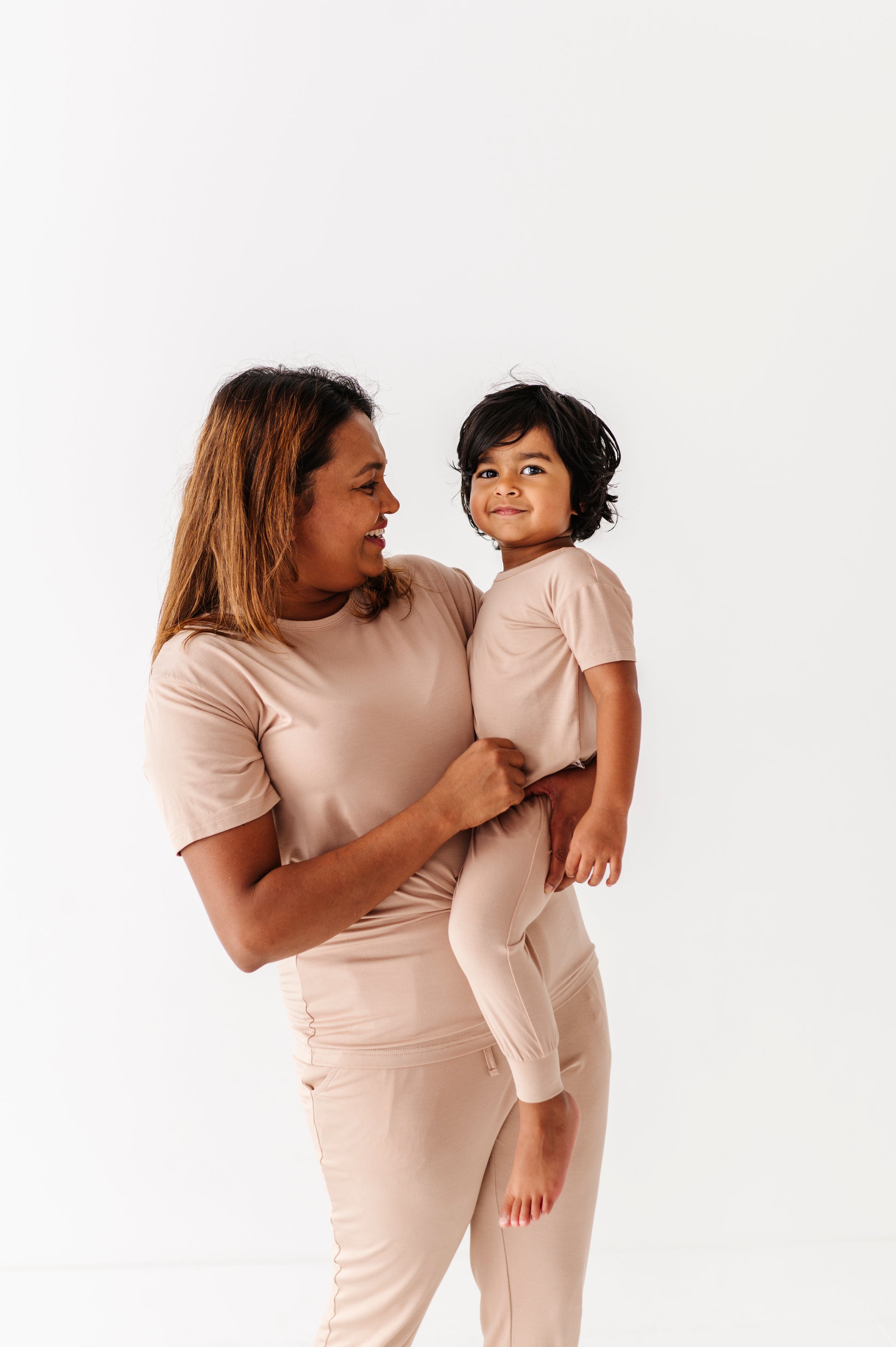 This set includes a solid short sleeve t-shirt and jogger pants, making it perfect for both men and women.